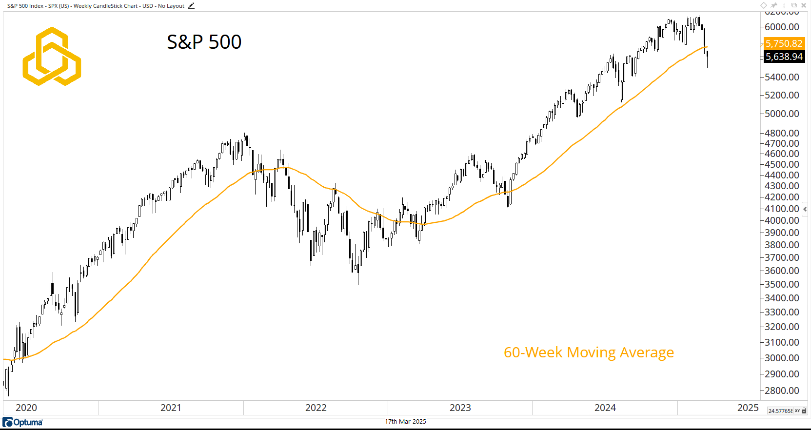 Starting with the S&P 500, we see that the index closed below the 60-week moving average last week. This was the first weekly close below this key measure of trend since October 2023. At the same time, the slope of the moving average is beginning to decrease. Clearly, there is a shift in the market trend.