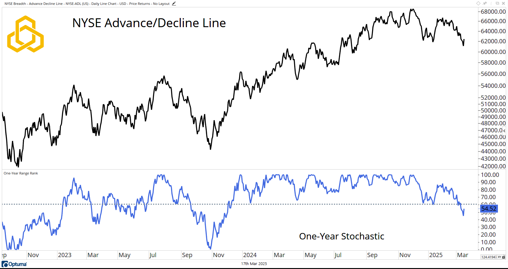 The NYSE Advance/Decline Line has been a mainstay in these pages over the past few weeks. It was there to give the benefit of the doubt to the bulls as breadth was “holding up.” That is no longer the case based on the one-year stochastic of the A/D Line. The stochastic now resides below 60% after spending much of 2024 above 80%. That shift is noteworthy.