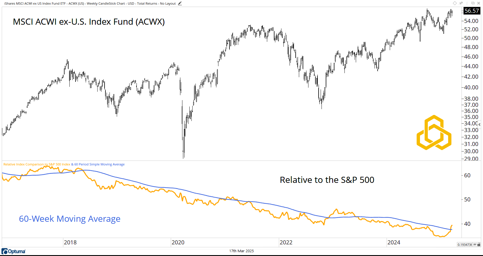 The ACWI ex-U.S. Index Fund has been an underperformer relative to the S&P 500 for more than a decade and a half. Token exposure here has been a drag on client portfolios. However, there may be a shift playing out.