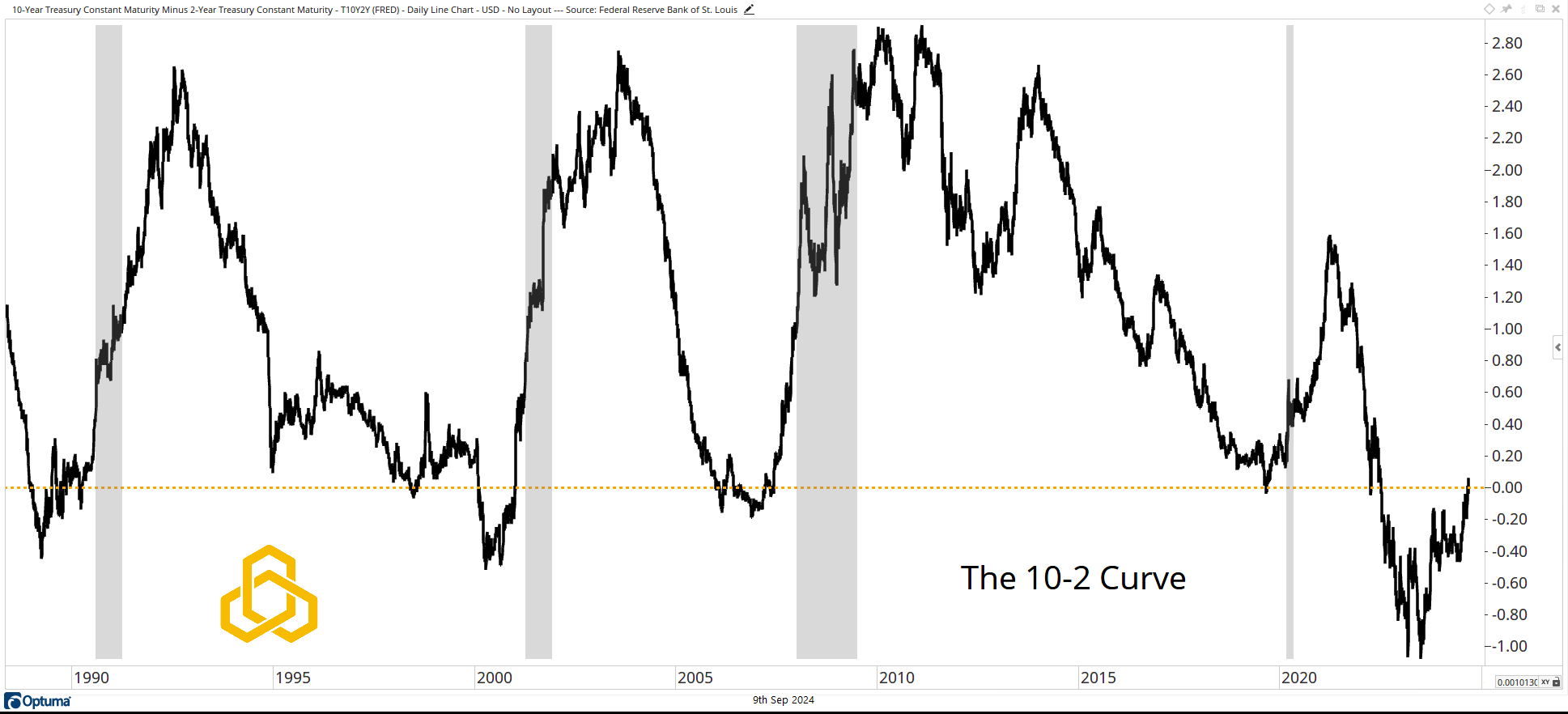 The shaded areas represent recessions in the U.S. Note that the past four recessions have begun after the curve has moved back to a positive, or un-inverted, position.