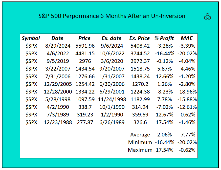 If an investor chose to buy the S&P 500 after the curve un-inverted, and held the position for six months, their average return would be 2.06%. While this does not sound like something to cause major concern, we want to highlight that the column that deserves the most attention is the one labeled MAE. This is the maximum adverse excursion, which is a fancy way of highlighting the deepest drawdown an investor would experience during the holding period.