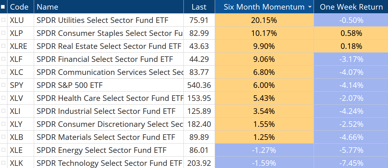 Six-month S&P 500 sector performance is already reflecting increased odds (but not a guarantee) of a more challenging environment. The top three performing sectors of the market — Utilities, Consumer Staples, and Real Estate — are usually considered for their defensive properties. Note that Staples and Real Estate were the only sectors to close higher last week.