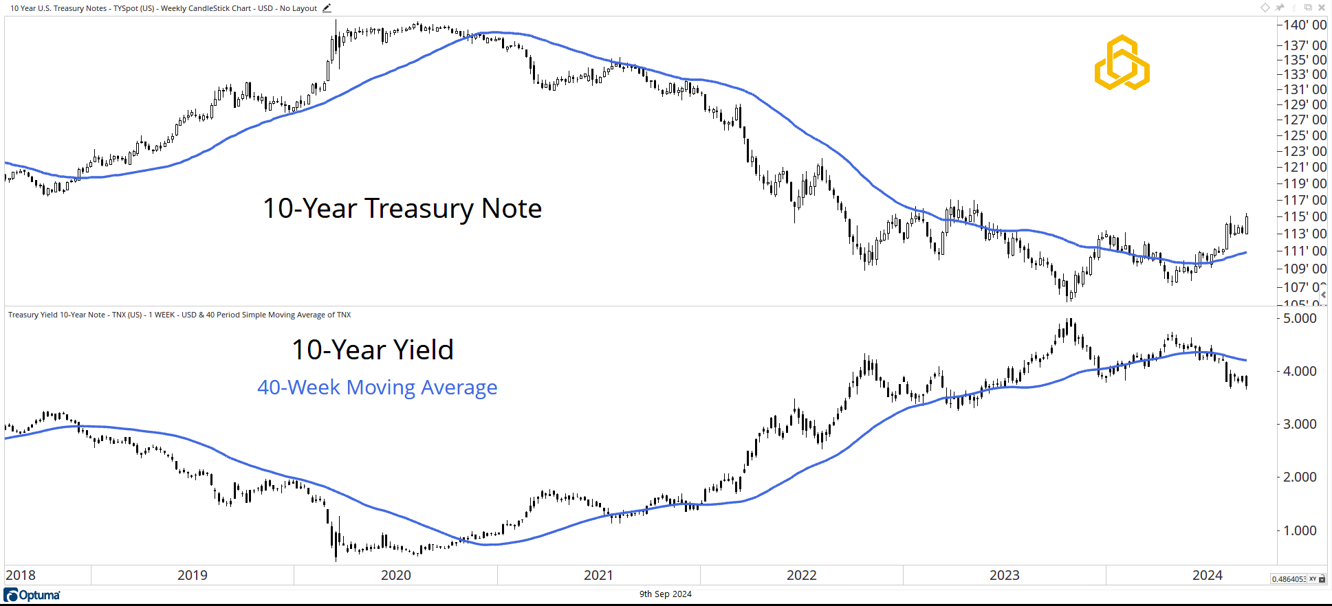 It is safe to say that the 10-Year Treasury Bond will receive a lot more attention in the days/weeks ahead. Zooming out to a weekly chart, we can see the bond is turning upward (yield turning lower) and trading above the rising 40-week moving average (the yield trades below the 40-week moving average).