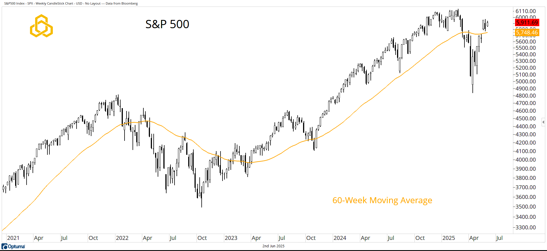 The index on everyone’s mind just logged its third consecutive week above the 60-week weighted moving average and remains within a stone’s throw of record highs. At the same time, after a brief dip, the moving average has turned higher once again.
