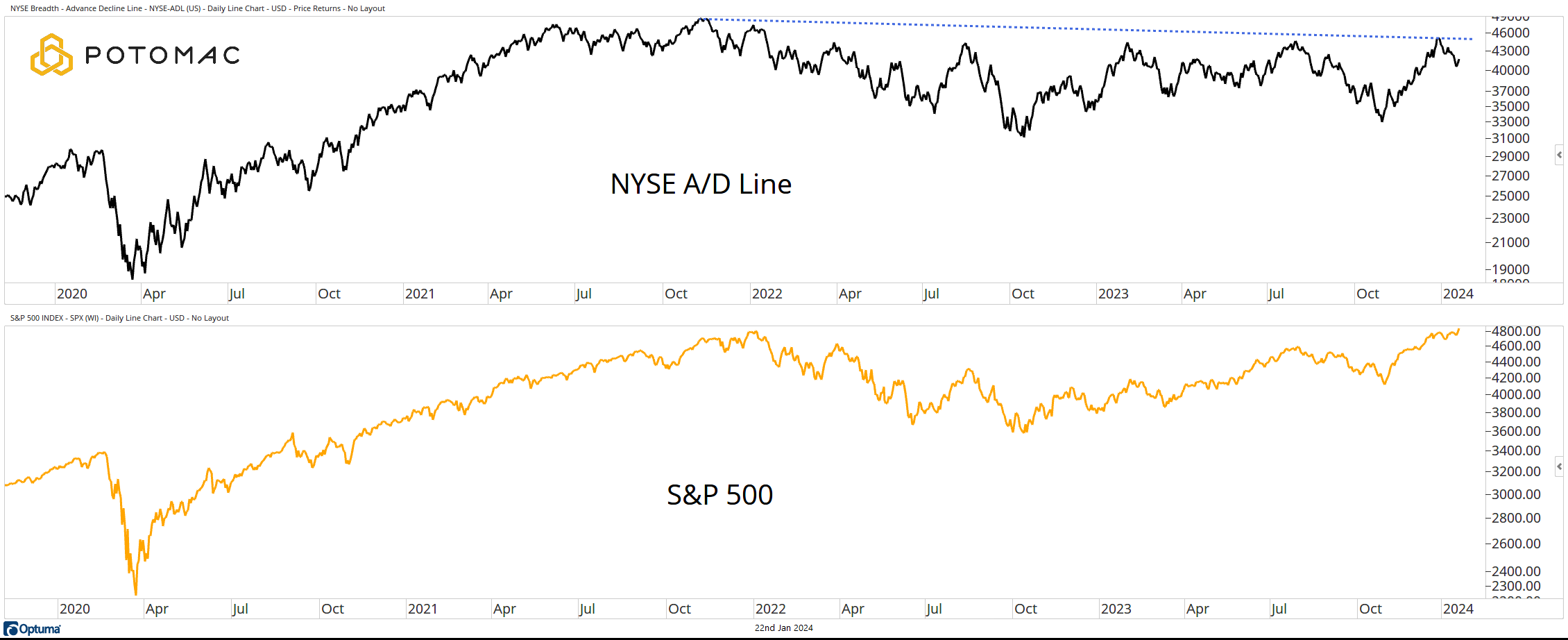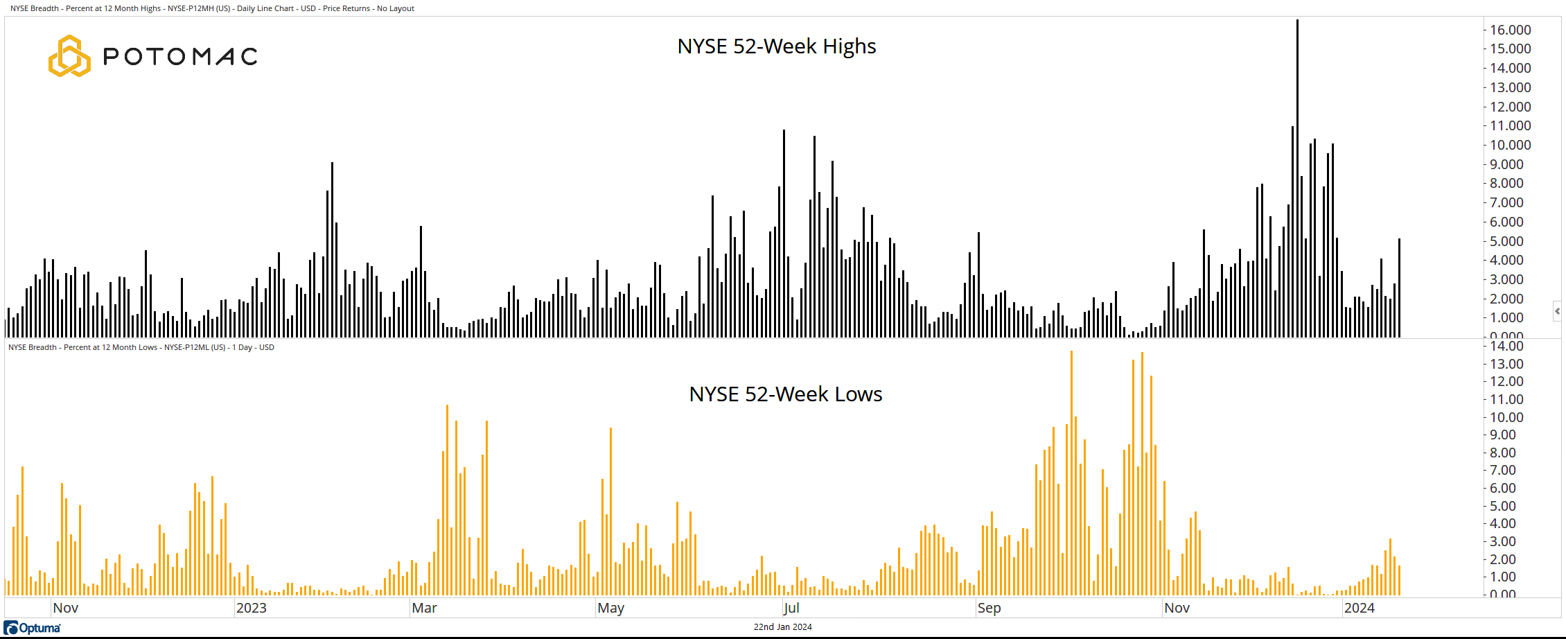 In a healthy bull market, we expect to see more stocks making new 52-week highs than those making new 52-week lows. That is exactly how 2023 ended. That is not what we are seeing thus far in 2024.