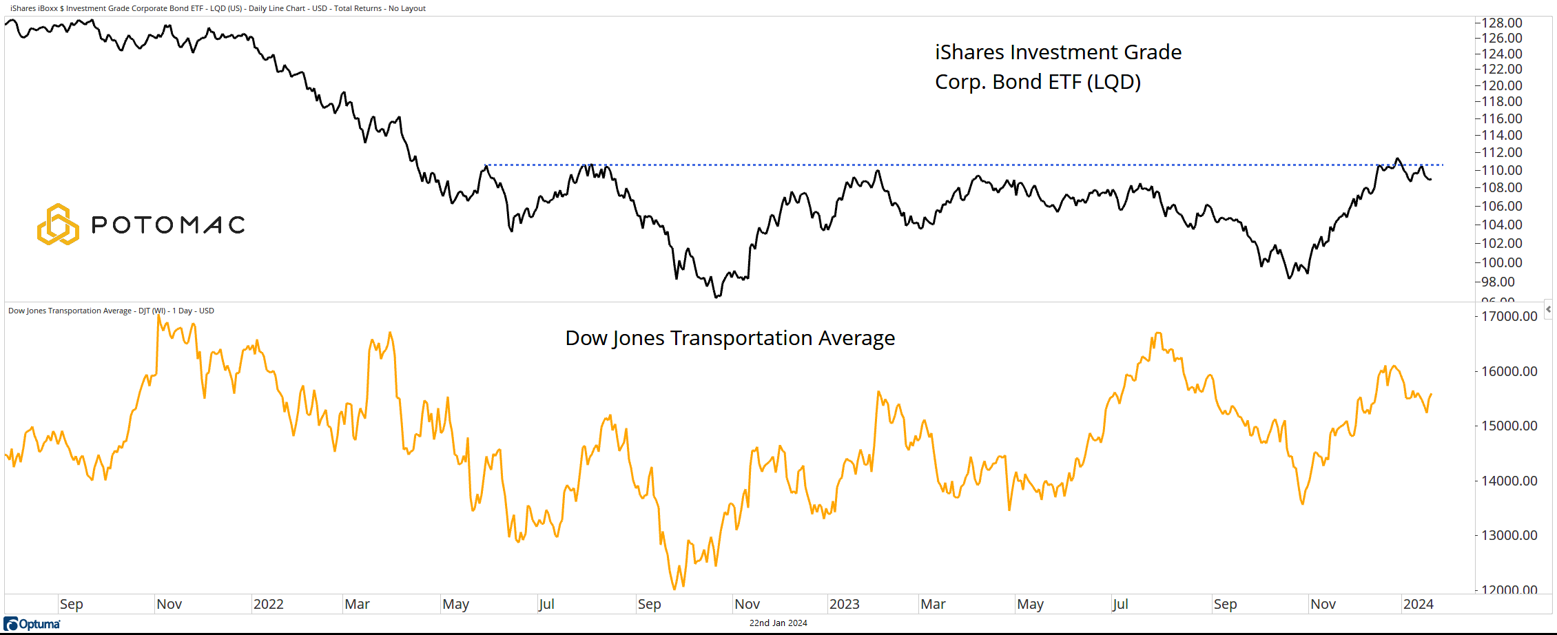 Two of the key themes on which we focus are the Bonds and Transports. Those who have been following along for nearly two years know that we have been highlighting a shift back to a positive stock/bond correlation. If we are correct, weakness in the bonds should be considered a red flag for stocks. The corporate bond ETF (LQD) is beginning to reverse at resistance and has not been able to sustain strength on rally attempts since 4Q2022.