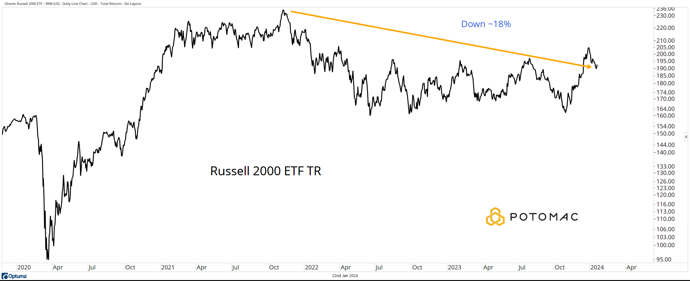 There was a chart making the rounds over the weekend depicting the S&P 500 at all-time highs while the Russell 2000 is nearly 20% from an all-time high (~18% on a total return basis).