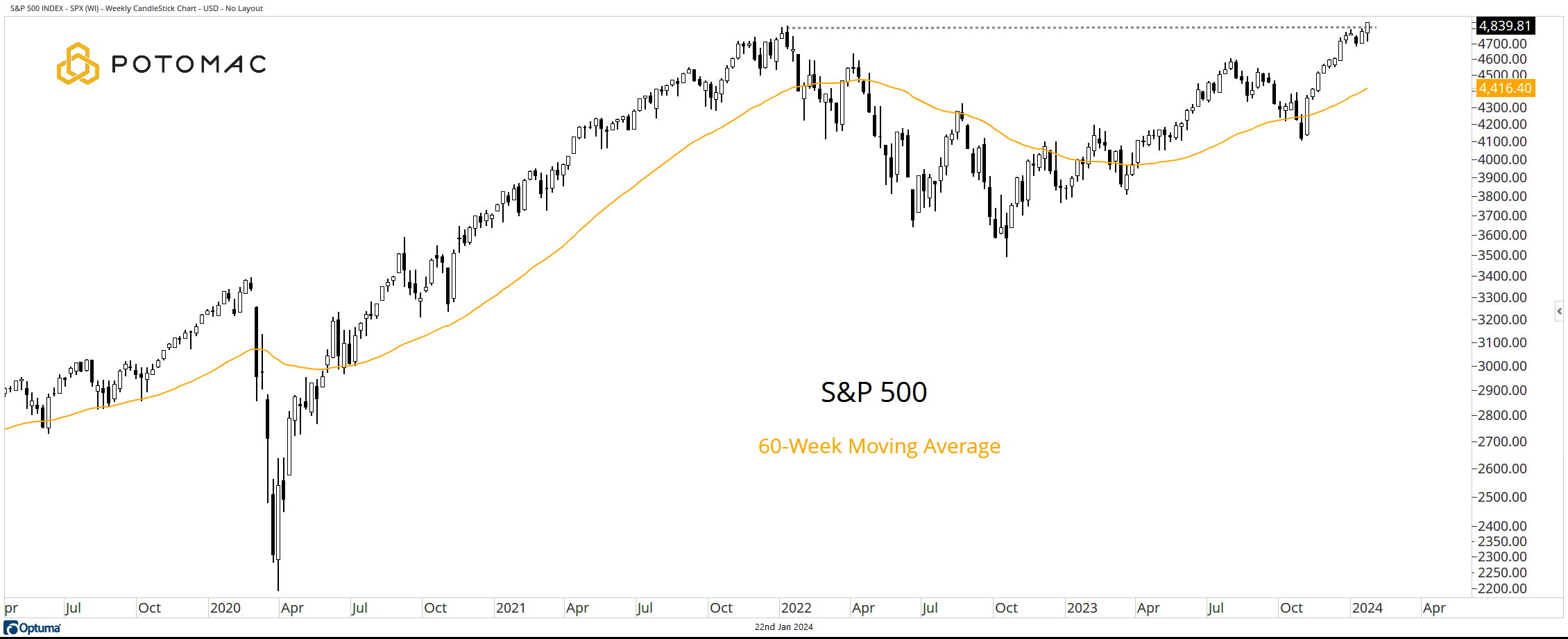 The S&P 500 closed the week at a new all-time high. That's right; in the face of an aggressive tightening cycle and numerous calls for a recession, the most widely benchmarked market in the U.S. (and possibly the world) went out at all-time highs. That puts it above the rising 60-week moving average.