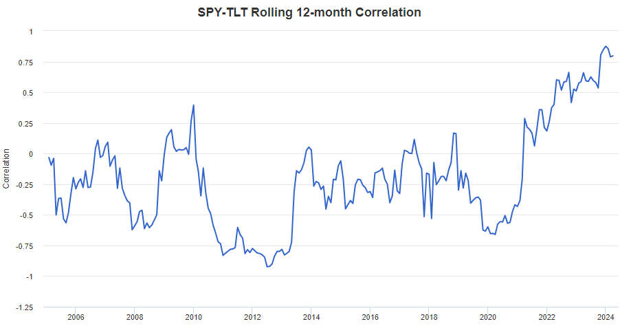 For example, view the chart below of the rolling 12-month correlation between stocks and bonds represented by the SPDR S&P 500 ETF Trust (SPY) and the iShares 20+ Year Treasury Bond ETF (TLT).
