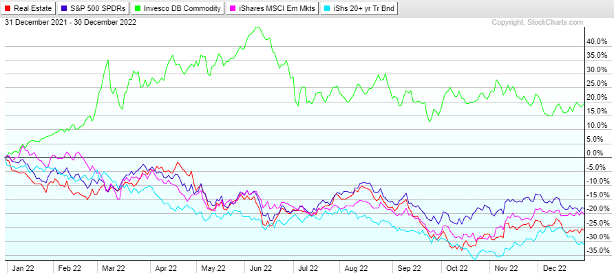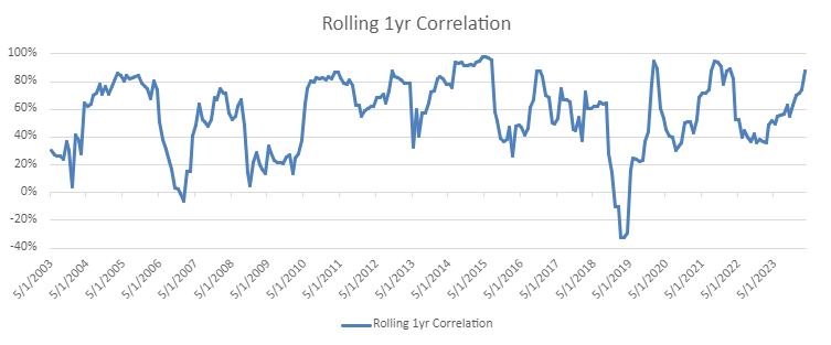 The chart below is 2022. Correlations rose again as most assets declined together. Commodities were the only positive asset class for the year.