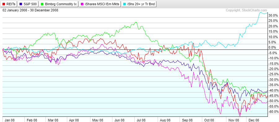 The first chart is 2008, when the only asset class with a positive return was treasury bonds at +30%.
