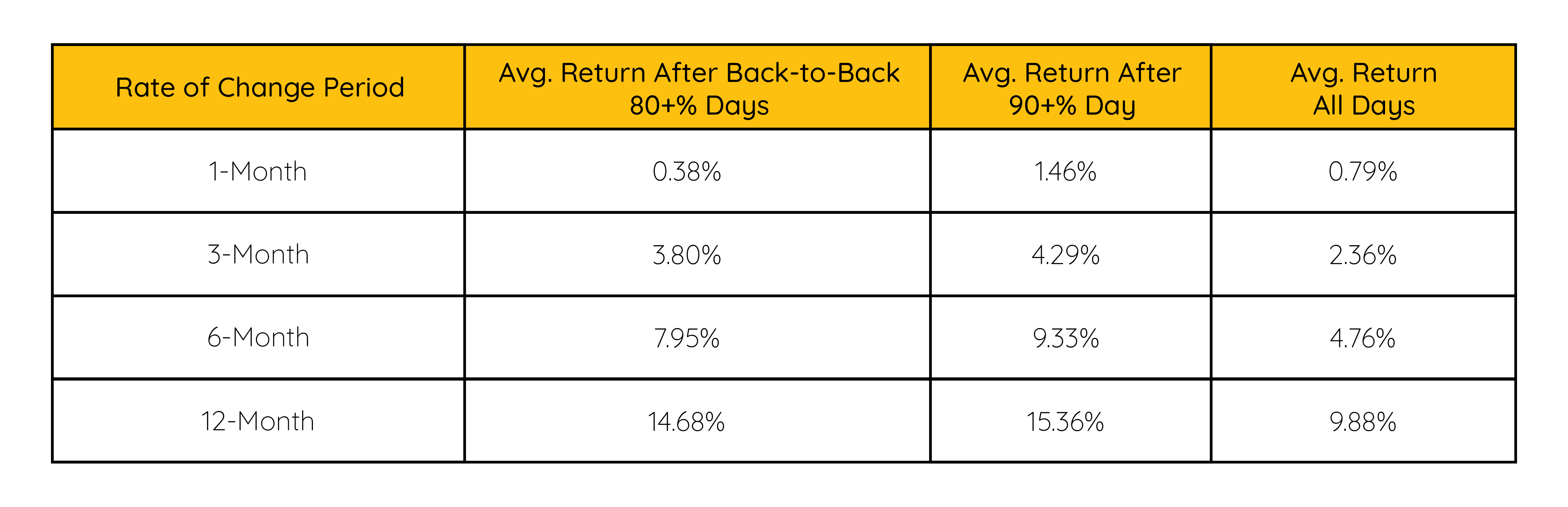 All timeframes, except for the one-month period following back-to-back 80% days, showed significant outperformance relative to all periods.