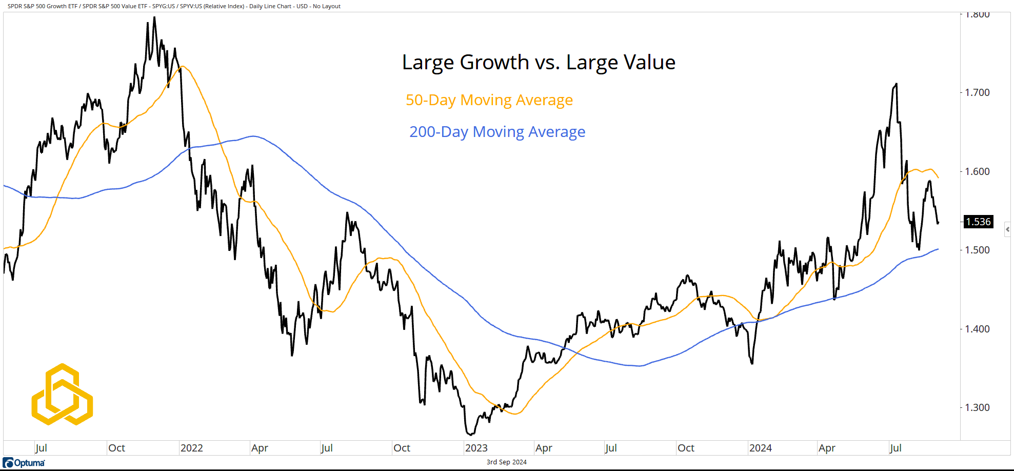 Broadening the scope a bit, we can see that Large Cap Growth trades below the 50-day moving average relative to Large Cap Value. A sustained move below the 200-day moving average could be a signal that the trend has turned decisively negative.