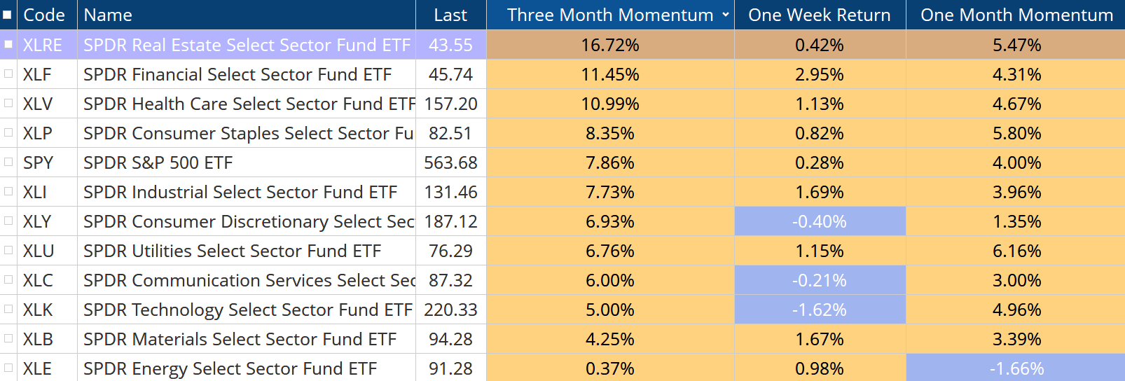 Looking at the eleven sector ETFs (sorted by three-month returns) we can see Real Estate is at the top of the list followed by Financials, Health Care, and Staples. Last week, as the S&P 500 closed a new record high, the Technology sector was the biggest loser.