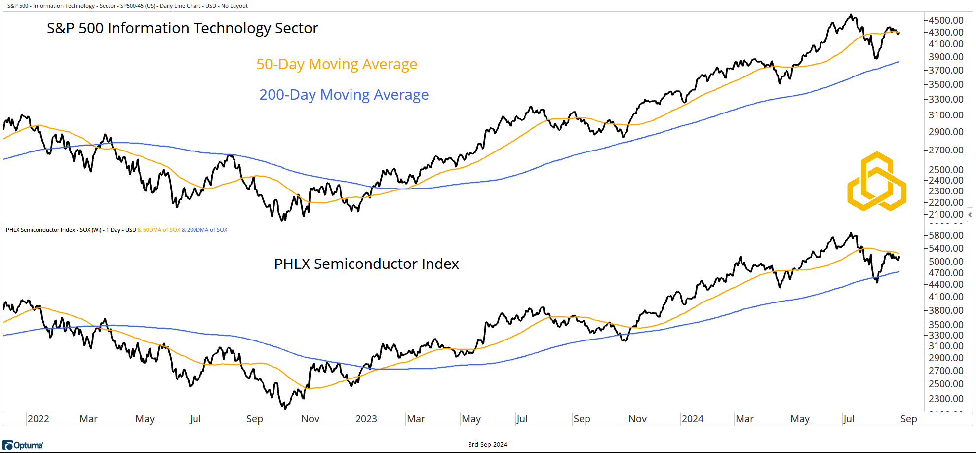 However, the Technology sector is not threatening new highs as it fights the flat 50-day moving average above the 200-day moving average. At the same time, the semis are below a declining 50-day moving average while holding above its 200-day.