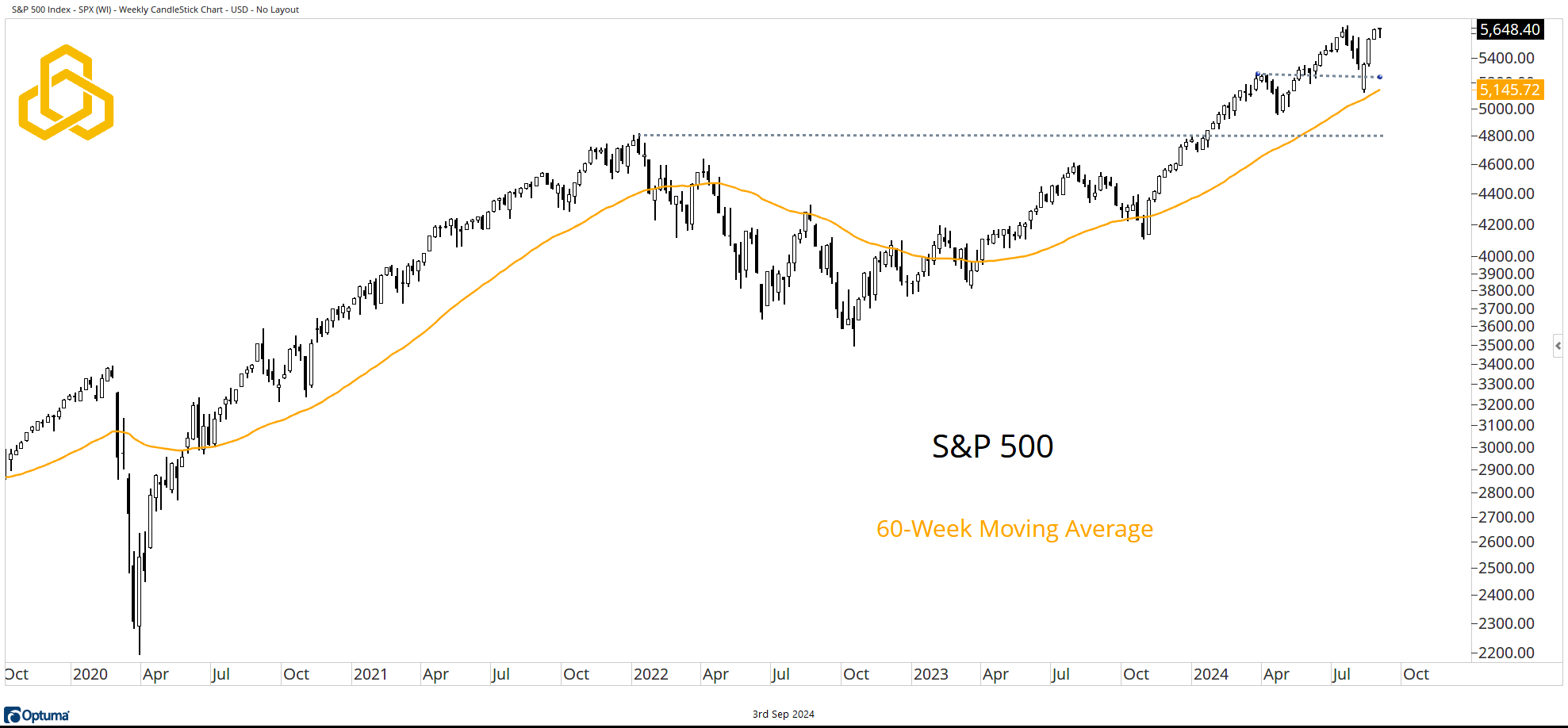 The main U.S. Index has all but erased the summer swoon and is on the cusp of a new high. The steadily rising 60-week moving average serves as an important guide. It is hard to argue the bear case based on this trend.