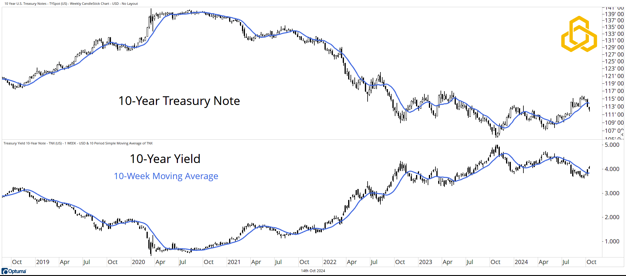 The 10-Year Yield closed higher for the third time in four weeks and has regained the 10-week moving average. Needless to say, bond prices have been moving lower over this time frame, inverse to the direction of stock prices.