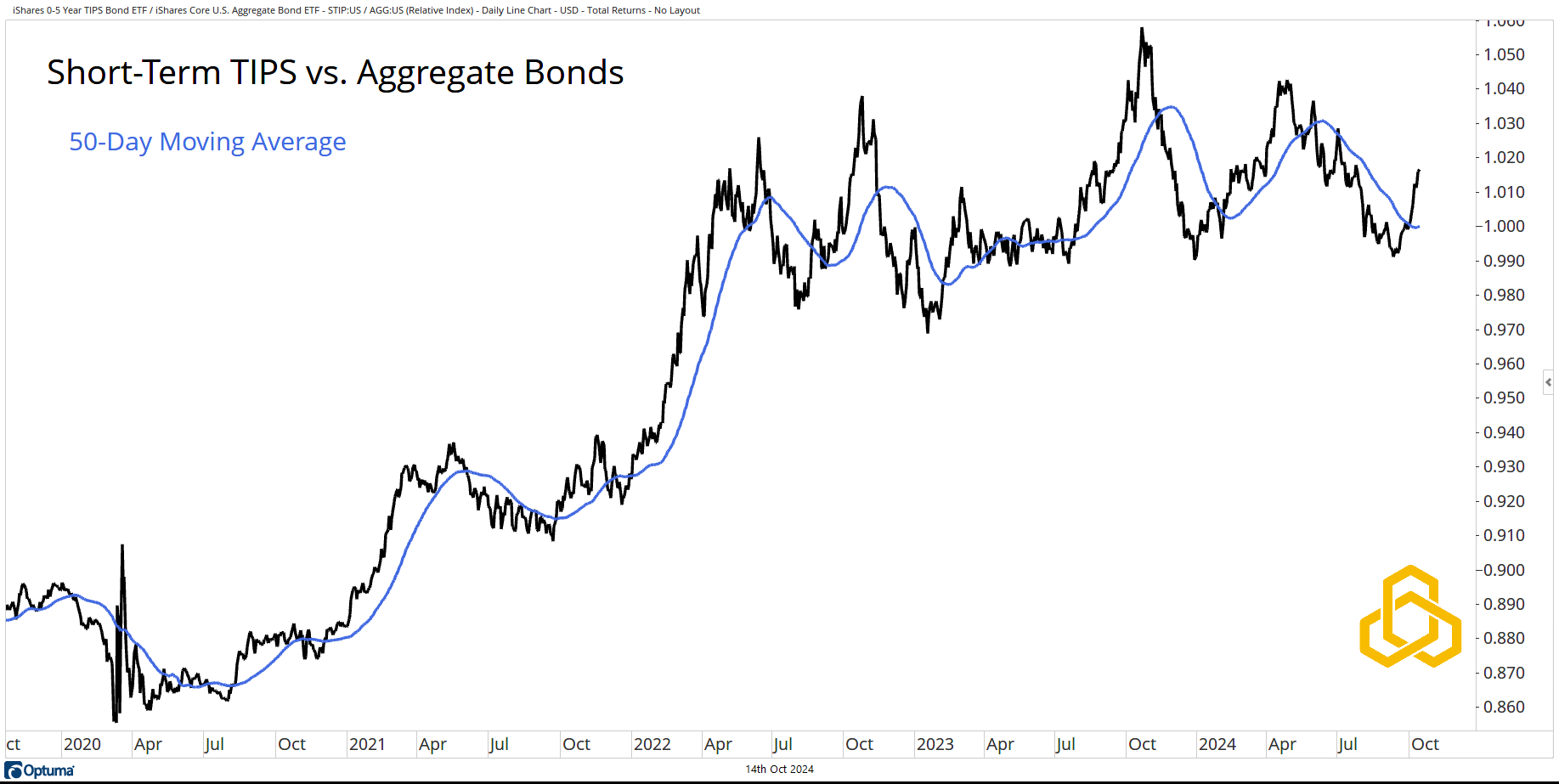 Despite the downward trend in Consumer Price Index (CPI) that the media likes to highlight, short-term Treasury Inflation-Protected Securities (TIPS) are still being bid up relative to the broader bond market. The ratio is holding in a consolidation near five-year highs, above the 50-day moving average.