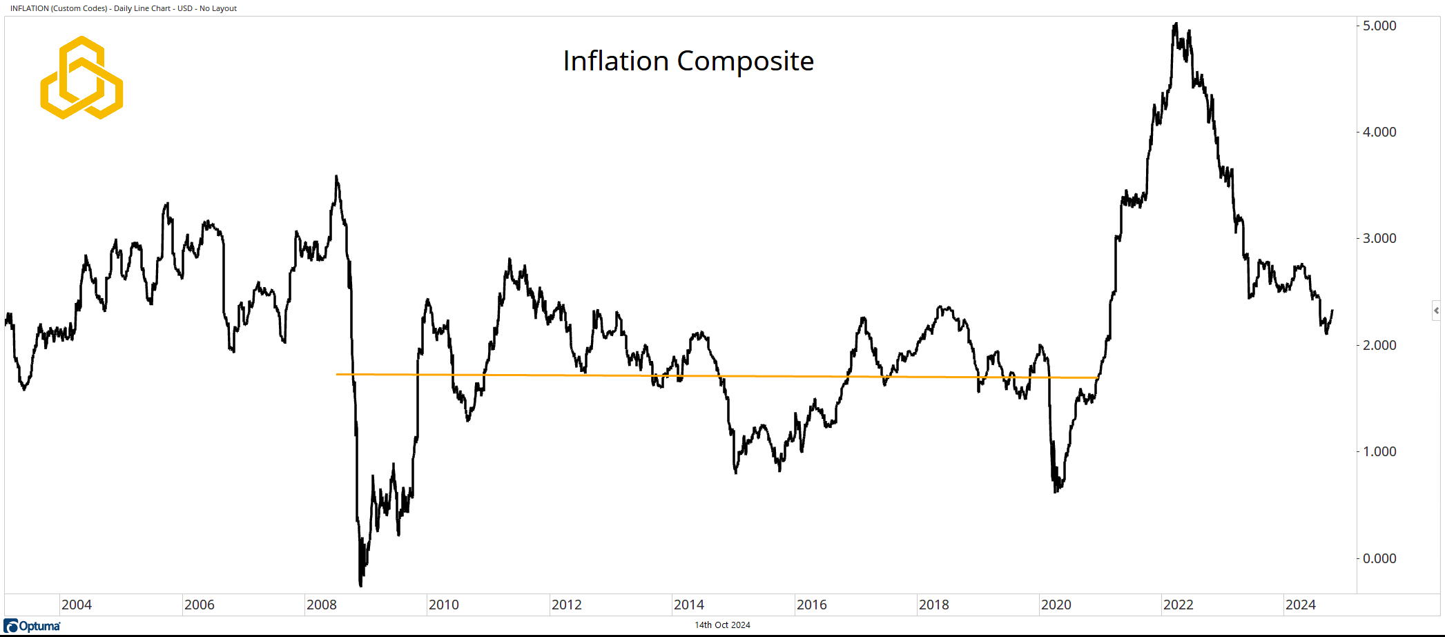Our Inflation Composite aims to dive deeper than the Consumer Price Index by incorporating both five- and ten-year market expectations for inflation. Our composite has started to move higher and remains well above the linear regression taken from the Global Financial Crisis through the COVID-era stimulus.